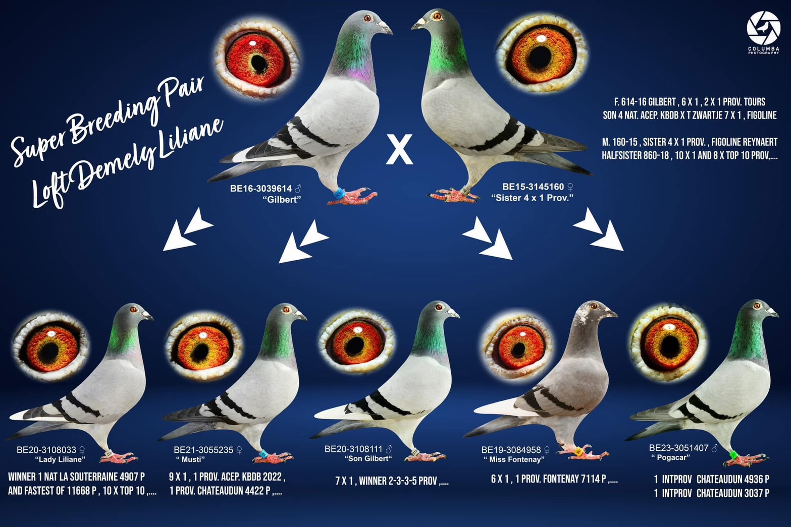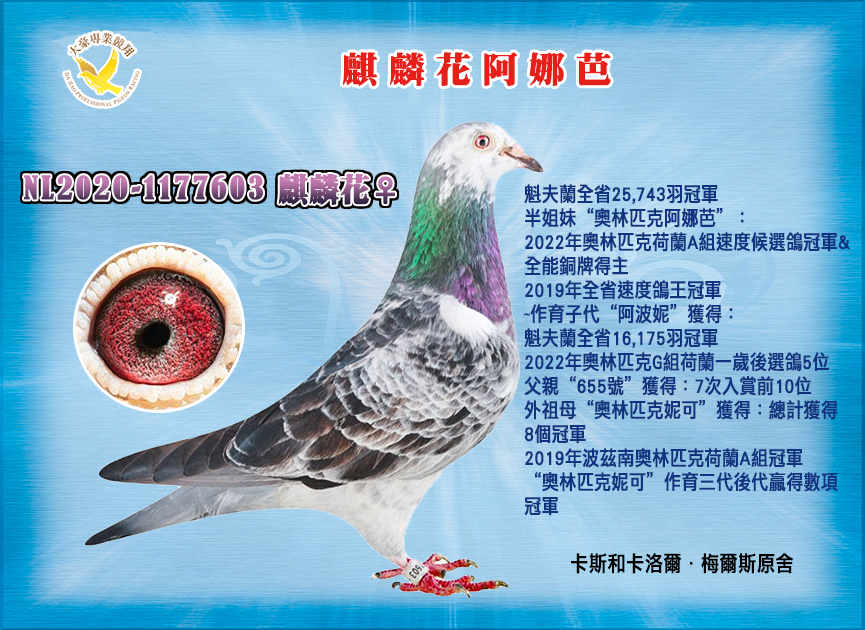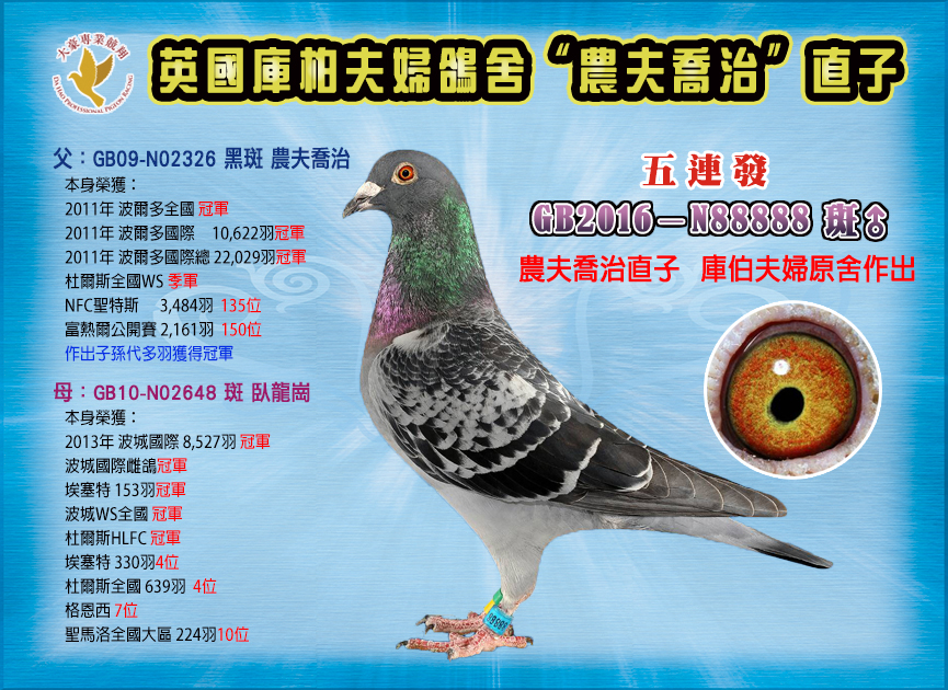英國:庫柏夫婦(Cooper Geoff & Catherine)世界銘鴿【農夫喬治】【臥龍崗】作出者三次勇奪世界馬拉松國際冠軍專長:艱困海翔、雨霧惡劣氣候操作英國:雷斯‧格林(Les Green )【最佳基特爾】英國合作競翔鴿舍英國知名四代養鴿家族,全國速度鴿王冠軍得主專長:范登布克、蘭布瑞契 速度幼鴿育種..