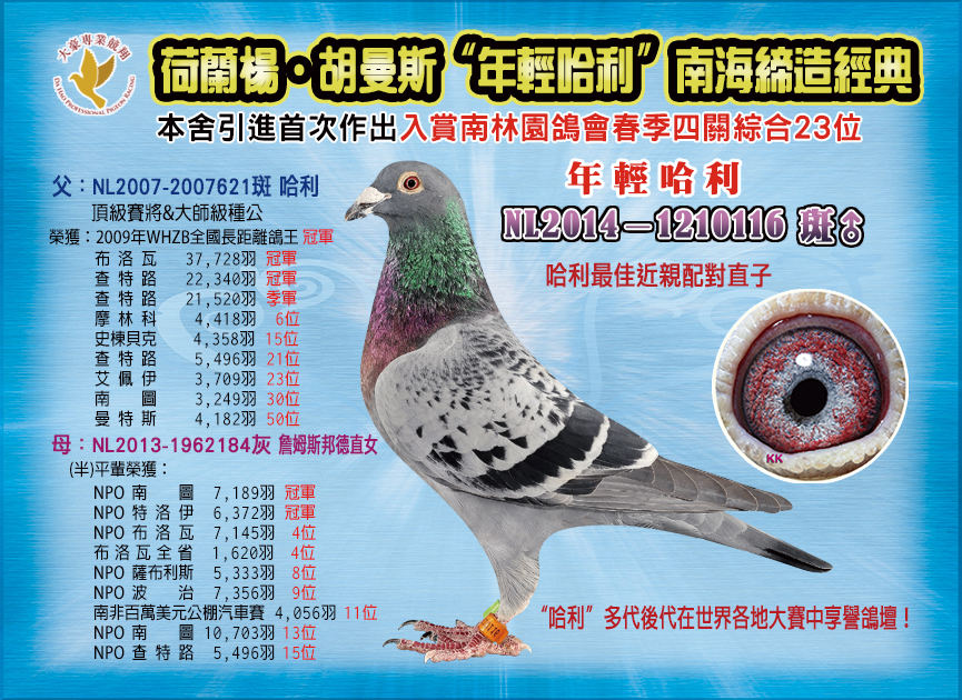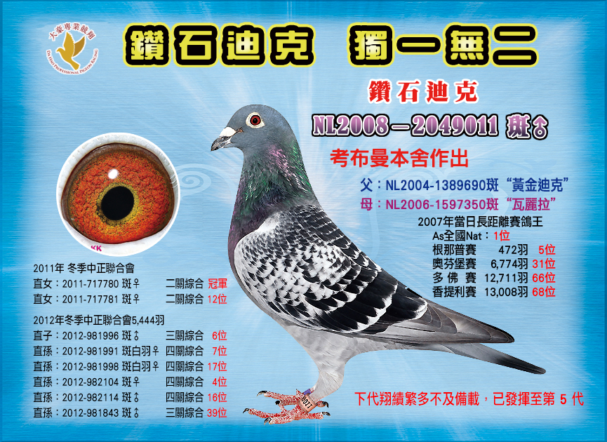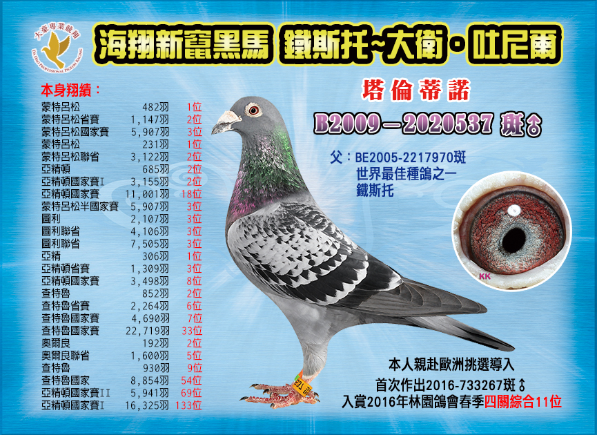 他誰?65歲,天生會跟動物說話,一輩子靠養豬養羊養馬來養家,橫掃各動物全國品評頭銜,老來決定重拾兒時樂趣,2012年才開始正式養鴿,成績一鳴驚人。甚麼血統?鐵三角沃克父子:基礎配對母【索拉直女420】,是沃克父子原舍,出自【霸龍】(【推土機】半弟)X【索拉】(【奧林匹克索蘭吉】全妹)文斯特拉:..